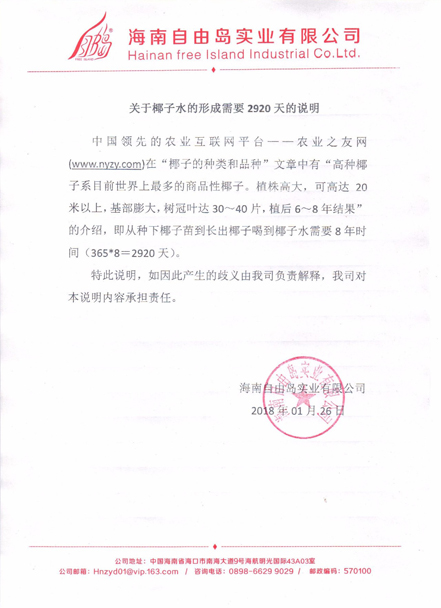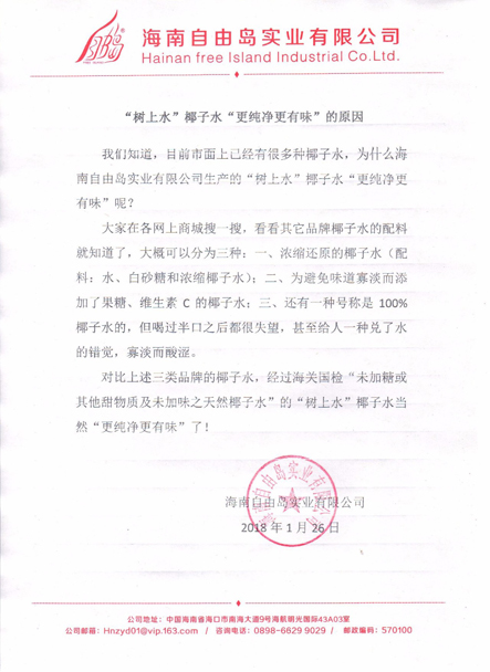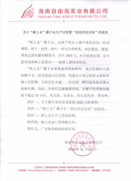 关于“树上水”椰子水生产过程暨“更纯净更有味”的说明。