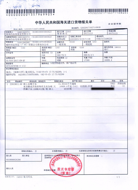 树上水椰子水釆集越南槟椥椰青,通过机械针孔提取椰子水,经过滤滤去沉淀物,再通过分离过程除去脂肪和微小沉积物,又经巴氏灭菌、二次过滤、瞬间超高温杀菌去除微生物,均化、冷却后无菌灌装而成,海关国检,品质保证……纯天然,无添加,富含钾,更营养。