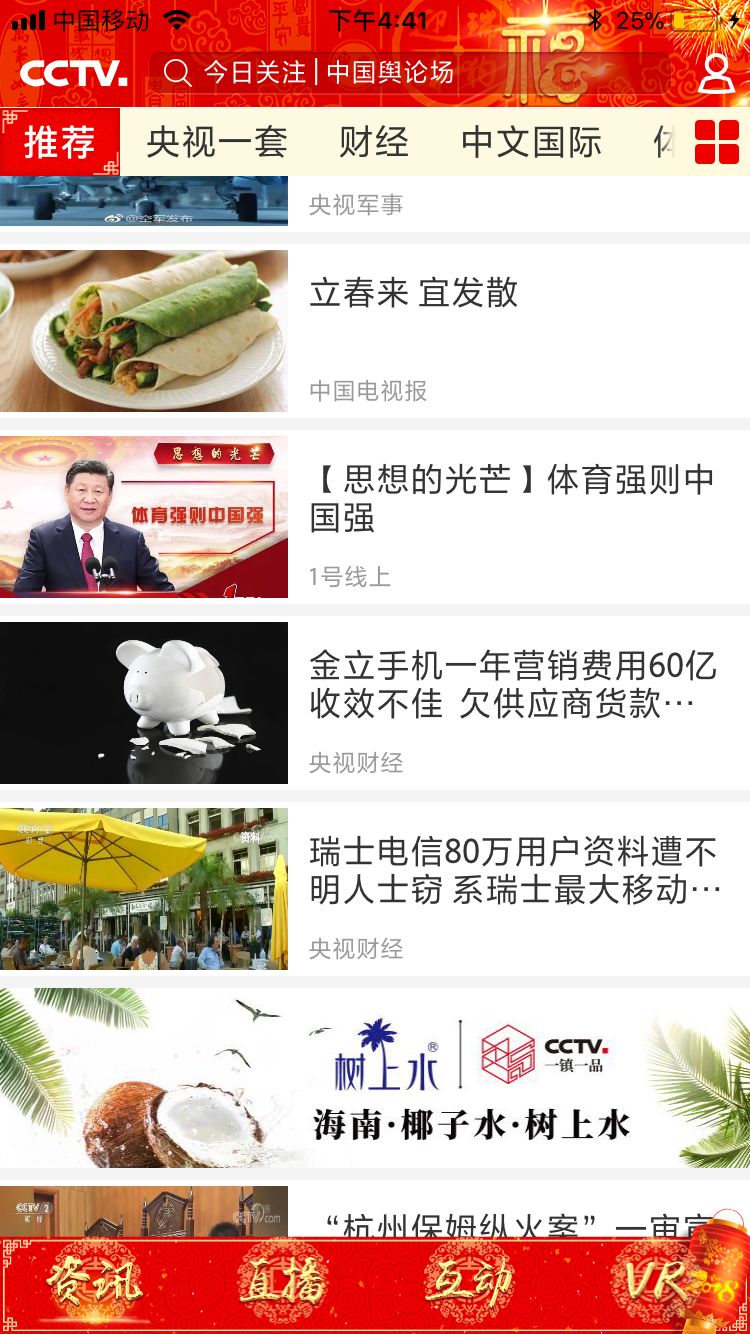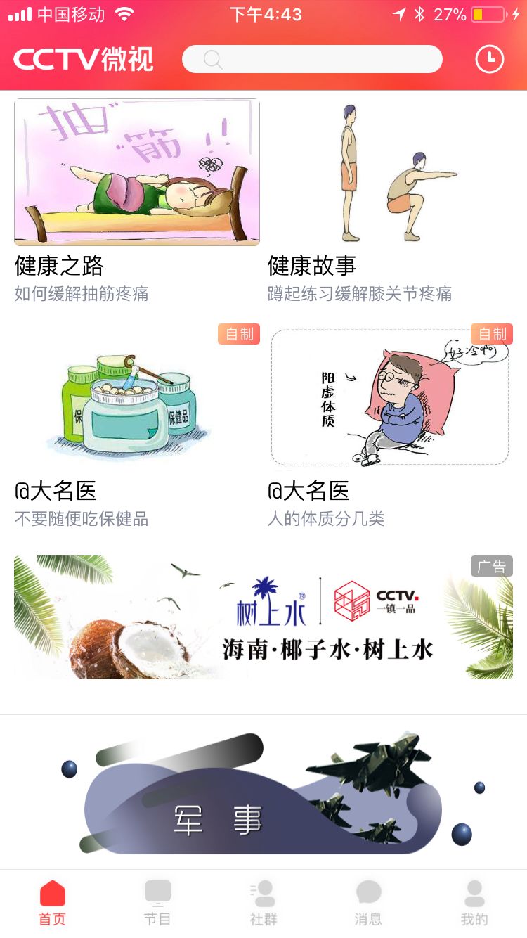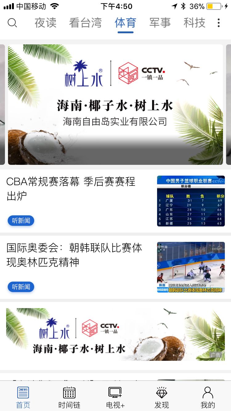 自由岛树上水广告在中央电视台-CCTV终端移动应用的中部通栏(1/4轮)展现。