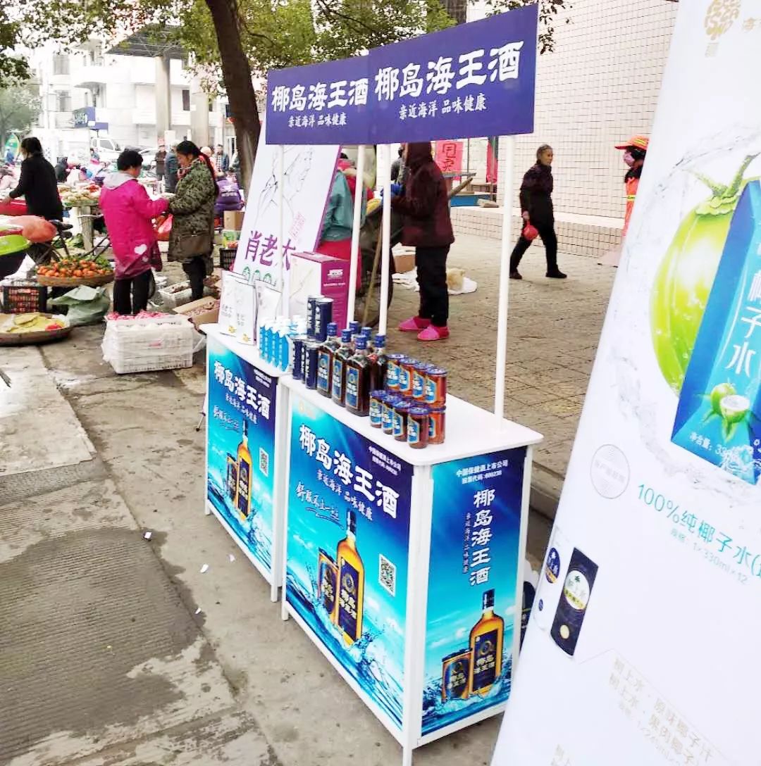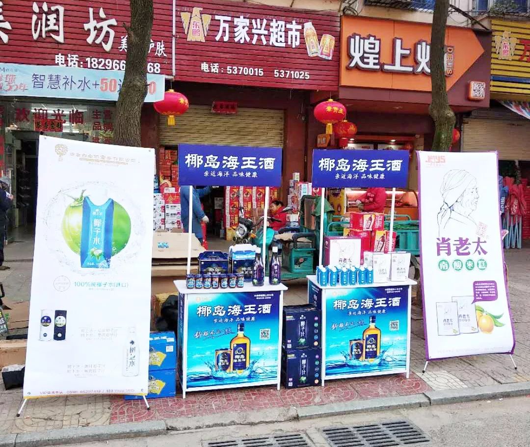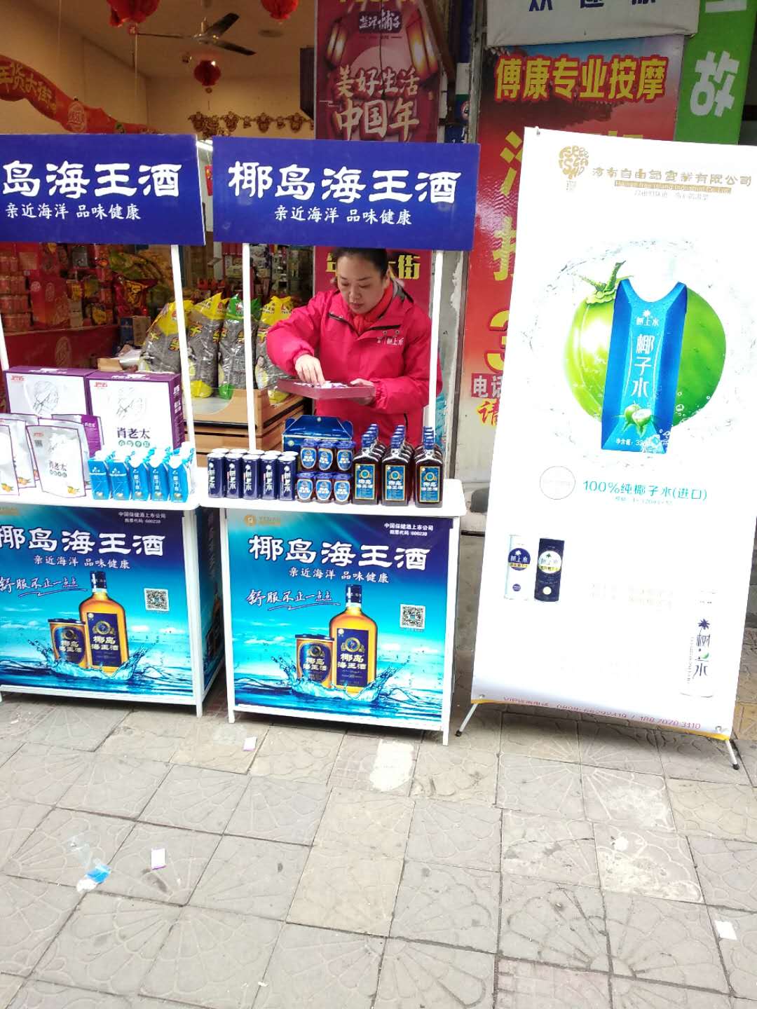 2018年2月8日,泰和市场部团队在遂川县水南社区做圩镇活动推广。上图为陈列好的肖老太南酸枣糕、树上水椰子水等品质新品格外显眼。