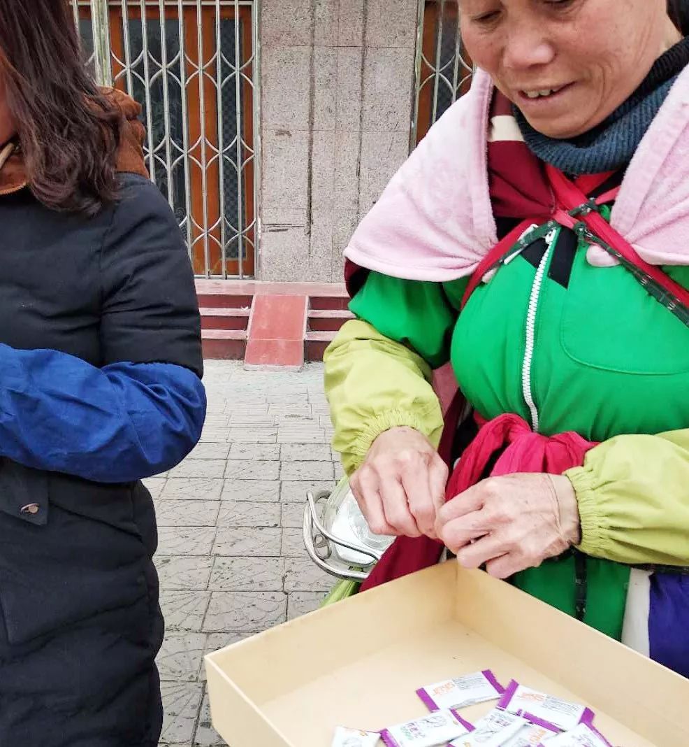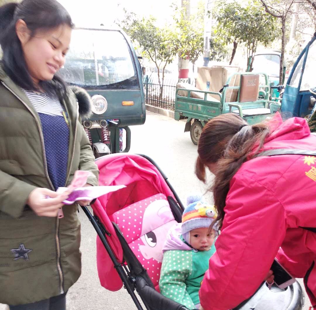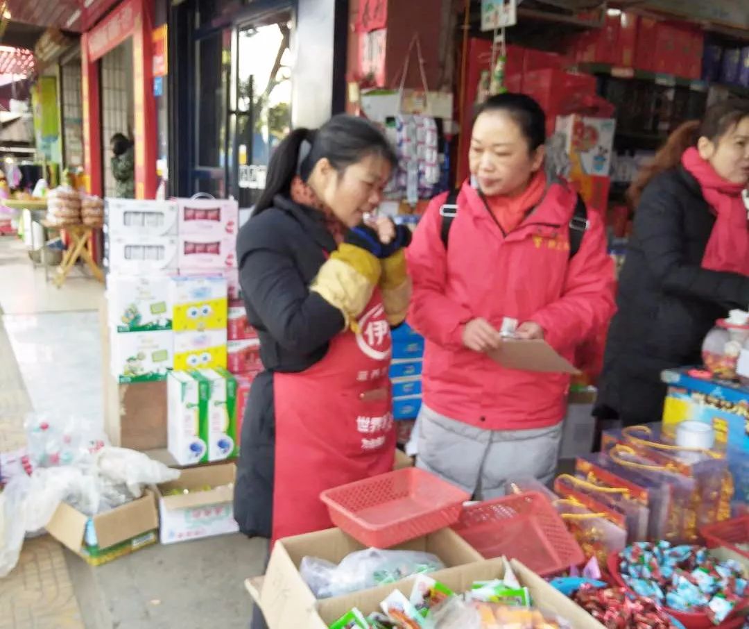 2018年2月7日,泰和市场部团队在遂川县小曾购物超市门口做圩镇活动推广。图为文利英正在陈列肖老太南酸枣糕、树上水椰子水等品质新品。