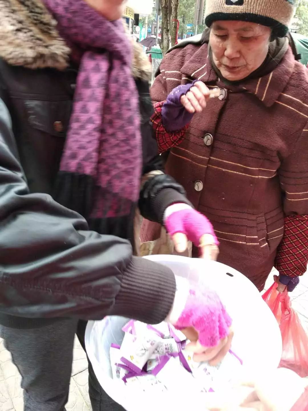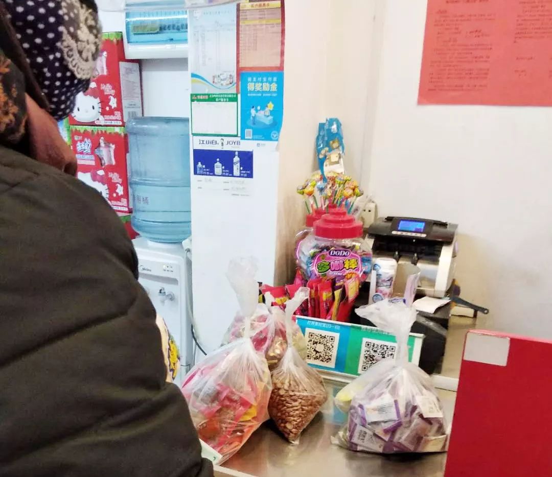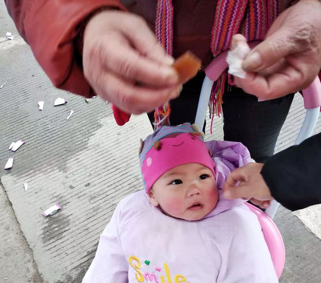 背着孙子的社区居民认真端详肖老太南酸枣糕。