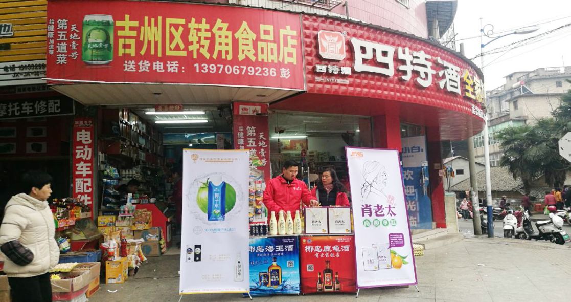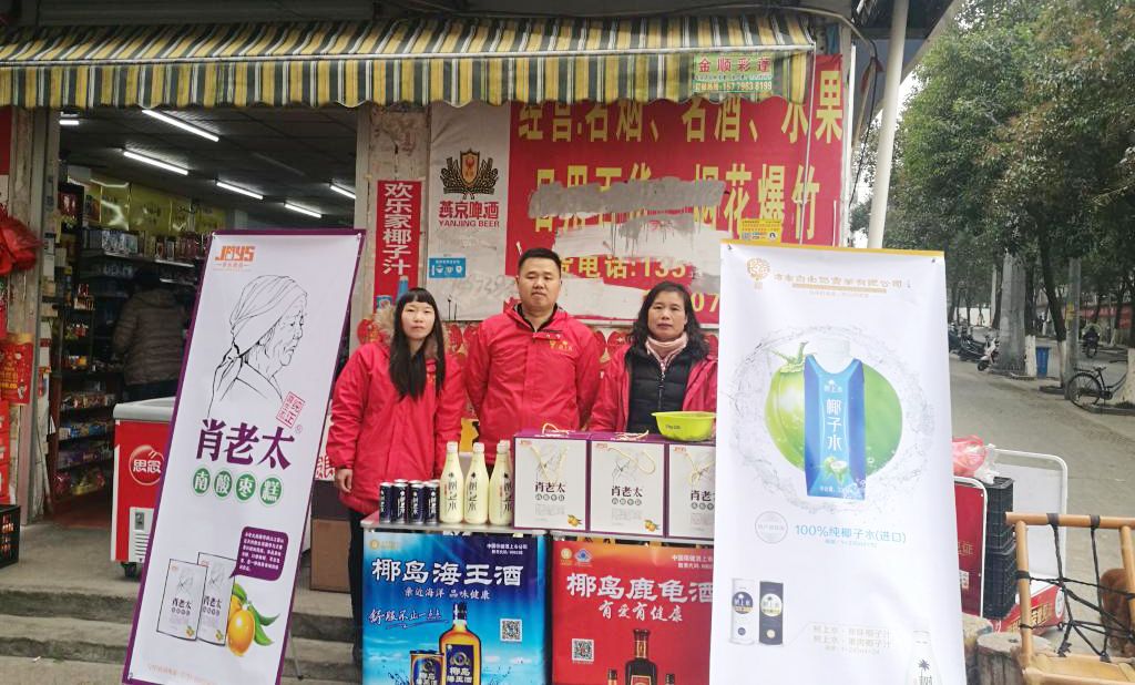 2018年2月9日,吉州市场部团队在吉州区青石街菜市场做圩镇活动推广。肖老太南酸枣糕、树上水椰子水等品质新品引人注目。上图为:吉州市场部长刘俊杰(中左)、吉州市场业务员汪佳香(中右)。