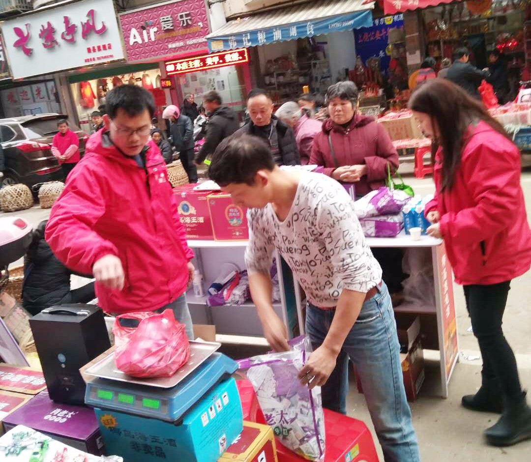 2018年2月12日,章贡市场部团队在章贡区水西镇和乐圩诚信批发门口做圩镇活动推广。上图为:陈飞(右一)、邓玉妹(右二),海南自由岛实业有限公司赣州后勤人员刘梦卿(左二)、宋秀云。
