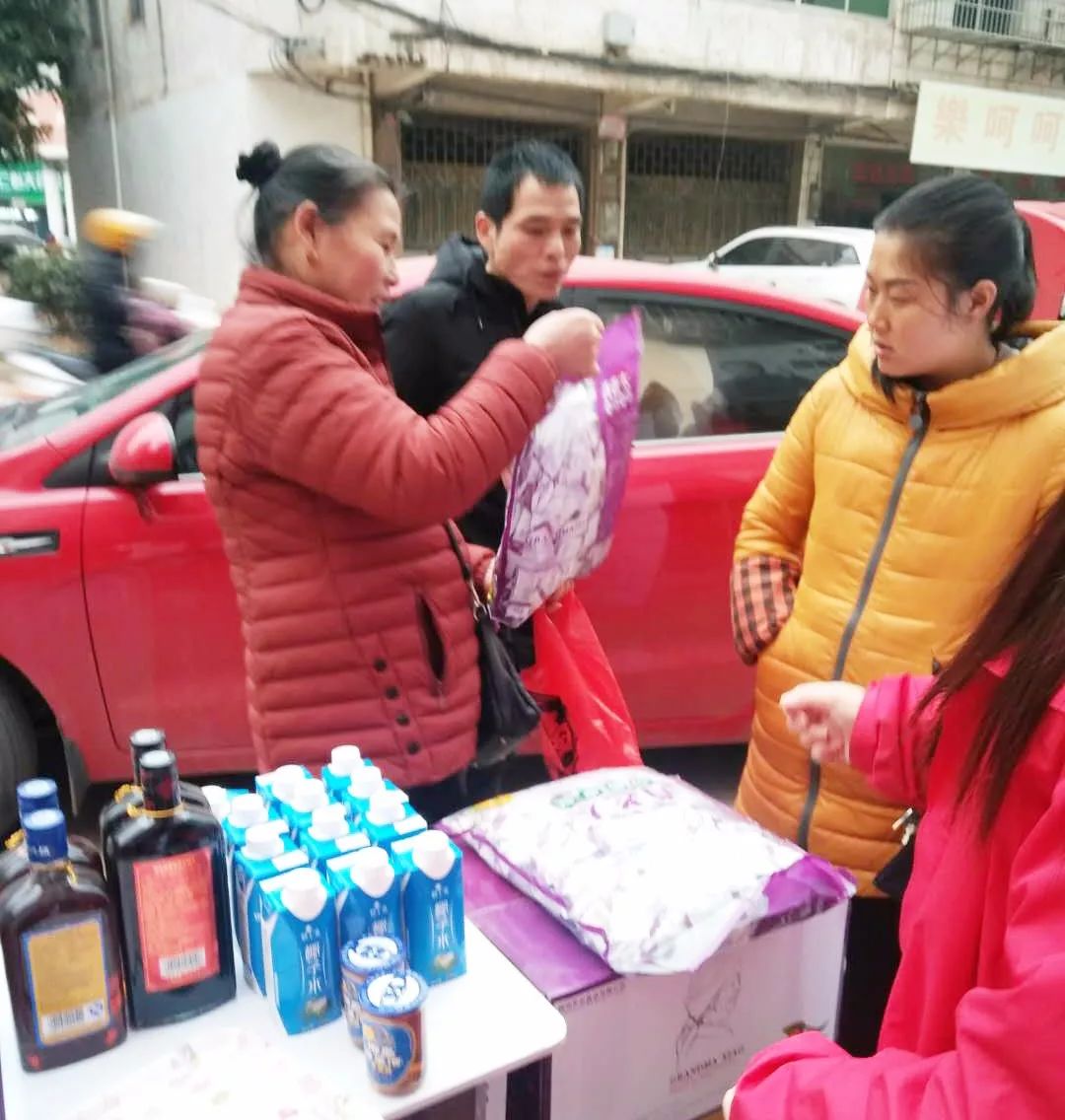 2018年2月10日,章贡市场部团队在赣县区城南市场雅堂超市门口做圩镇活动推广。上图为:章贡市场部长陈飞(左二)、赣县业务员张夏阳(右一)、章贡业务员邓玉妹(左一)。