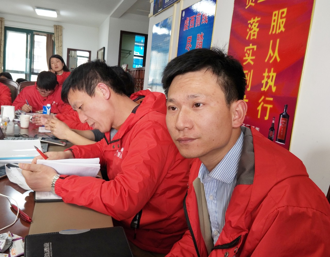 宜春片区经理钟辉凡(前一)认真专注的神情。