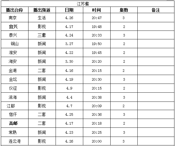 “自由岛,树上水,更纯净,更有味”随片广告语在江苏省各地市县电视台播出时间表