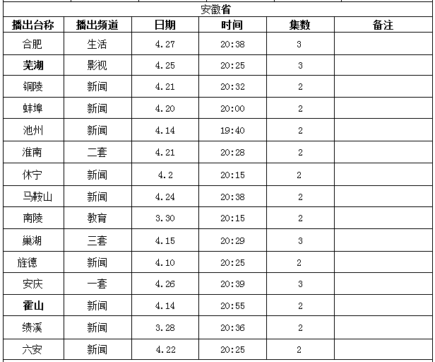 “自由岛,树上水,更纯净,更有味”随片广告语在安徽省各地市县电视台播出时间表