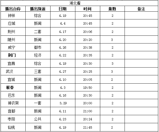 “自由岛,树上水,更纯净,更有味”随片广告语在湖北省各地市县电视台播出时间表