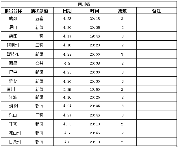 “自由岛,树上水,更纯净,更有味”随片广告语在四川省各地市县电视台播出时间表