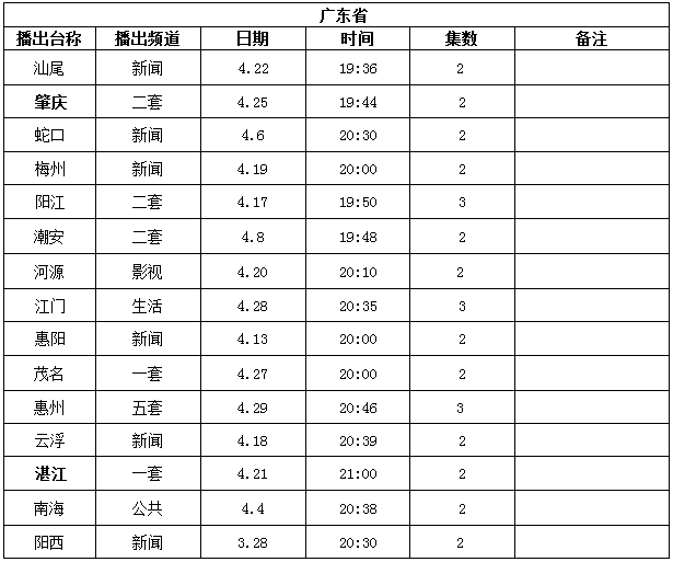 “自由岛,树上水,更纯净,更有味”随片广告语在广东省各地市县电视台播出时间表