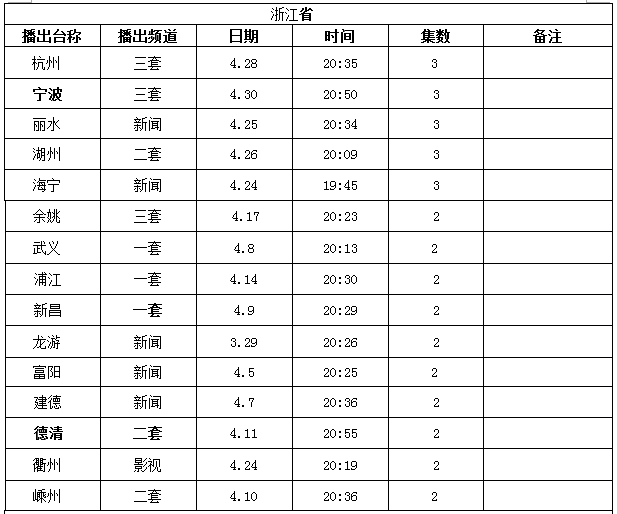 “自由岛,树上水,更纯净,更有味”随片广告语在浙江省各地市县电视台播出时间表