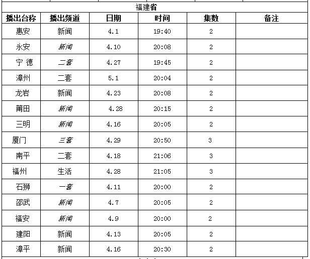 “自由岛,树上水,更纯净,更有味”随片广告语在福建省各地市县电视台播出时间表
