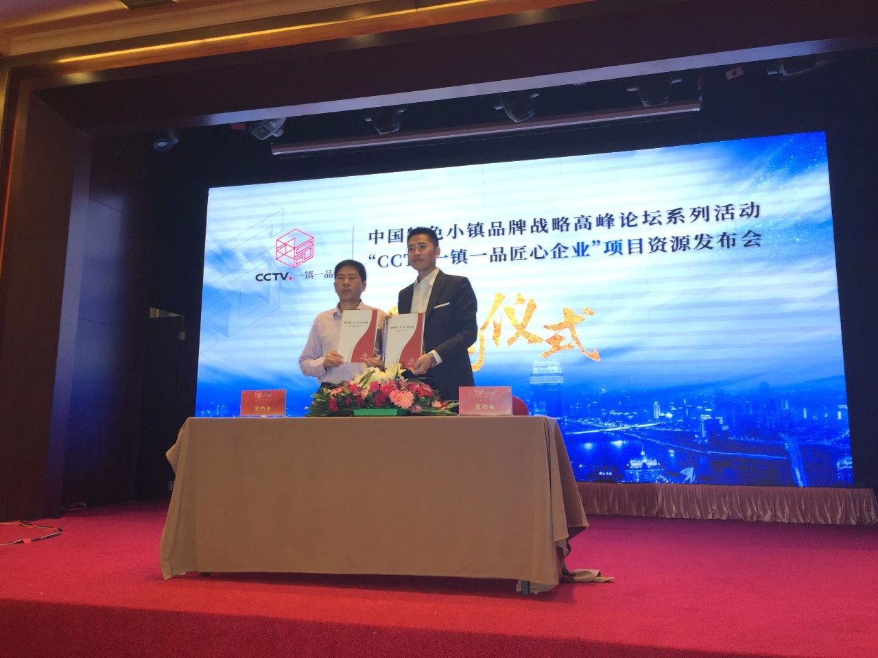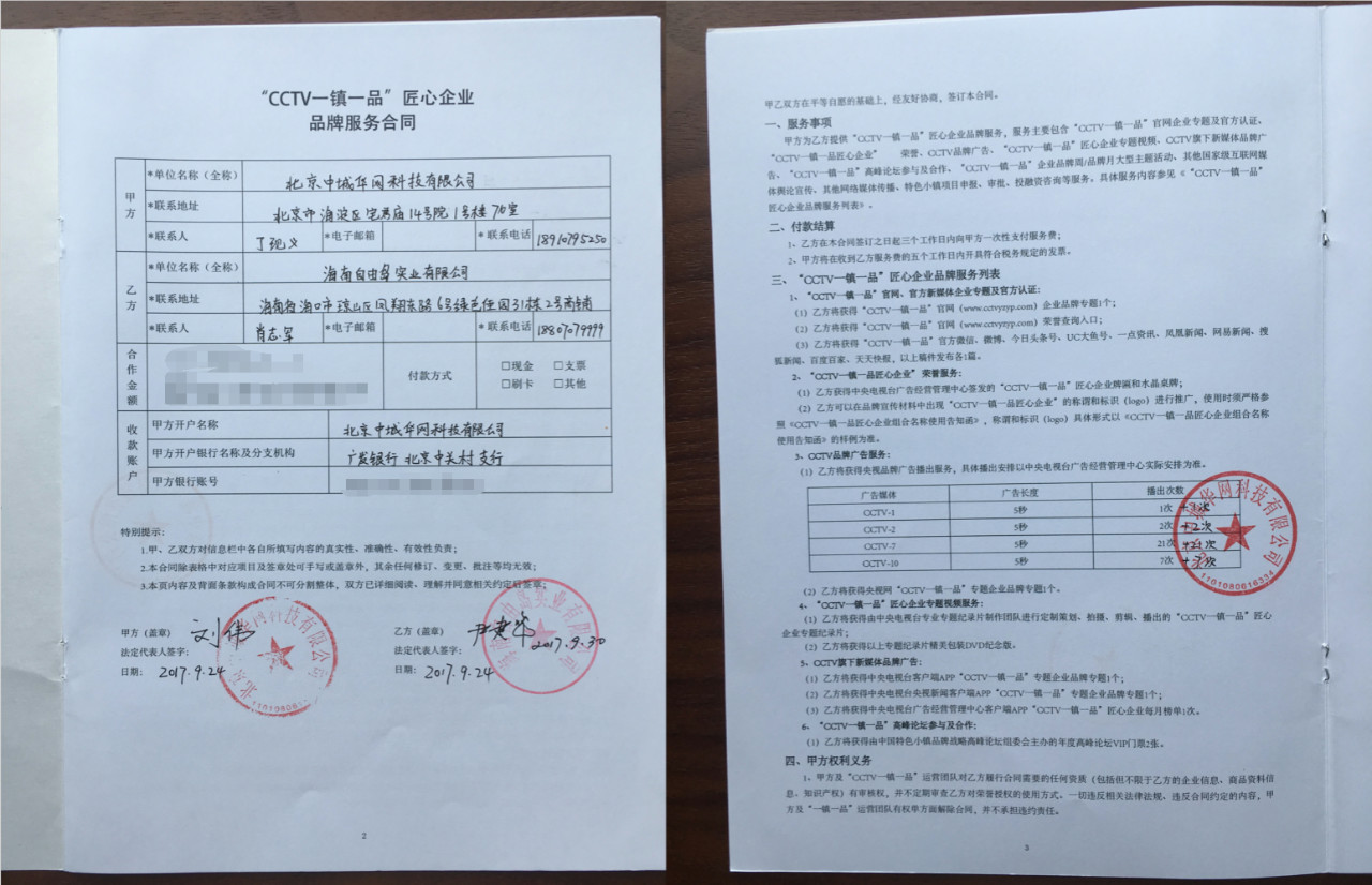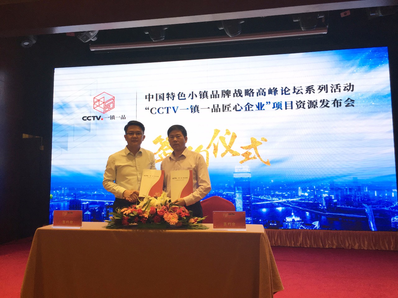 肖志军先生(右)与“CCTV一镇一品”’项目运营中心品牌总监王森先生签署《“CCTV一镇一品”广告协议》