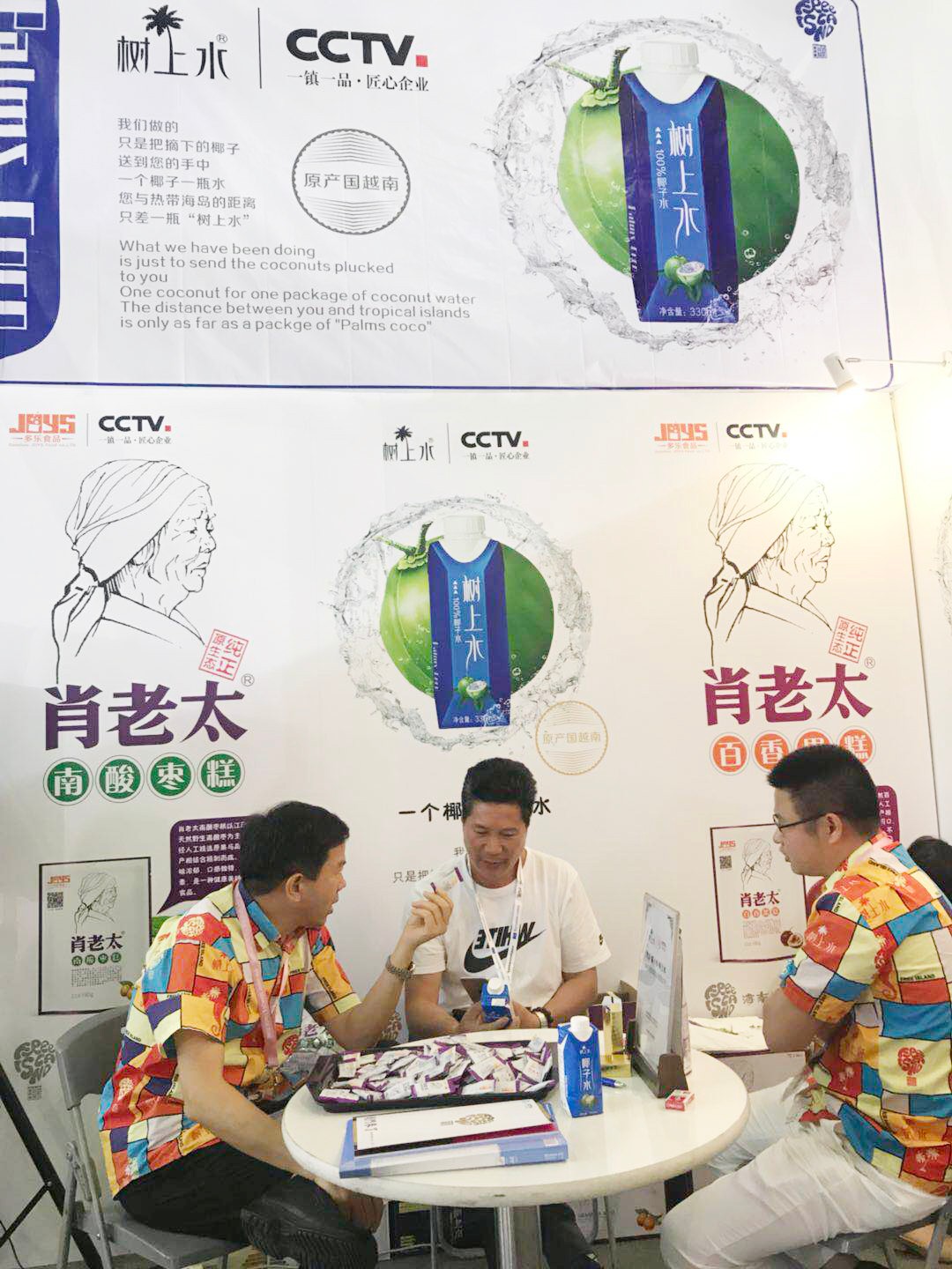 中食展上,越南Betrimex公司代表与自由岛工作人员一起,就树上水椰子水市场需求作进一步分析和沟通,并为产品品质代言。