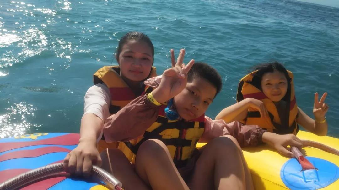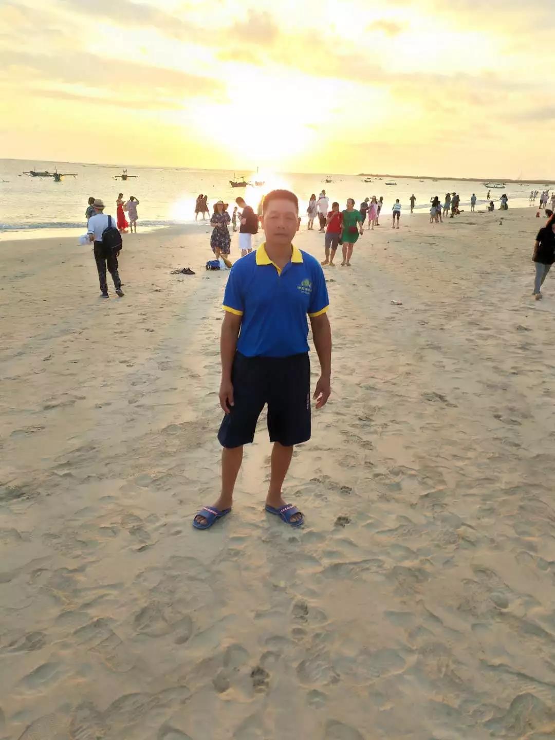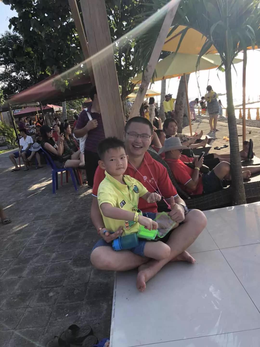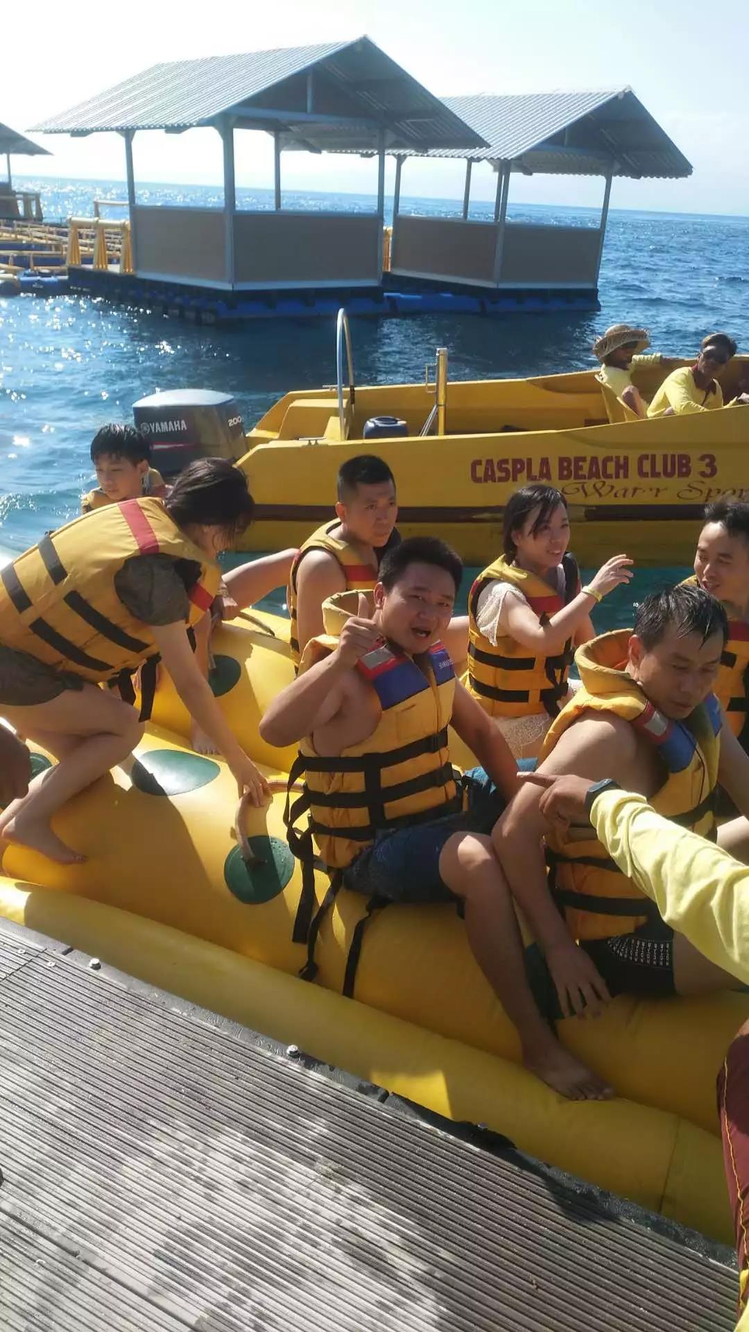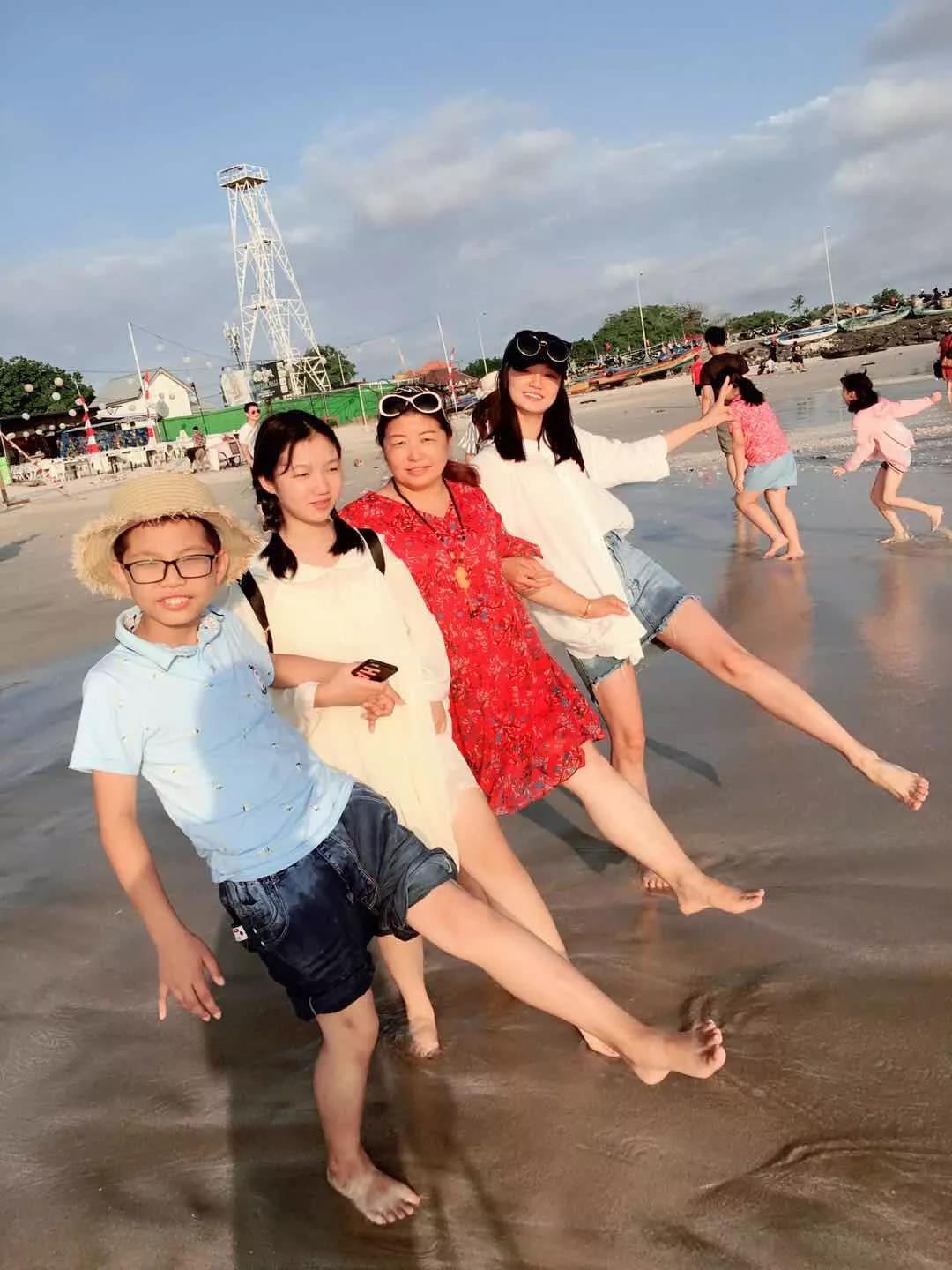 今天是自由活动的日子,这里海滩平坦、沙粒洁白、沙细滩阔、海水湛蓝清澈,是个玩冲浪、滑板的乐园。不少团员都冲向了大海。