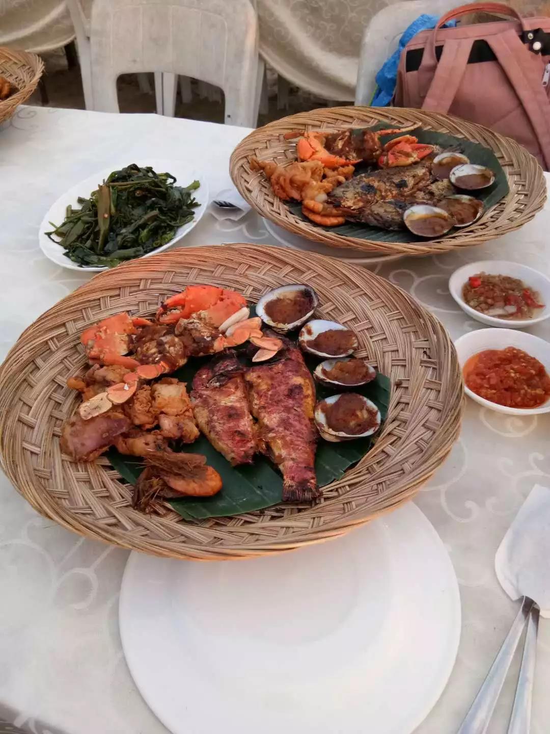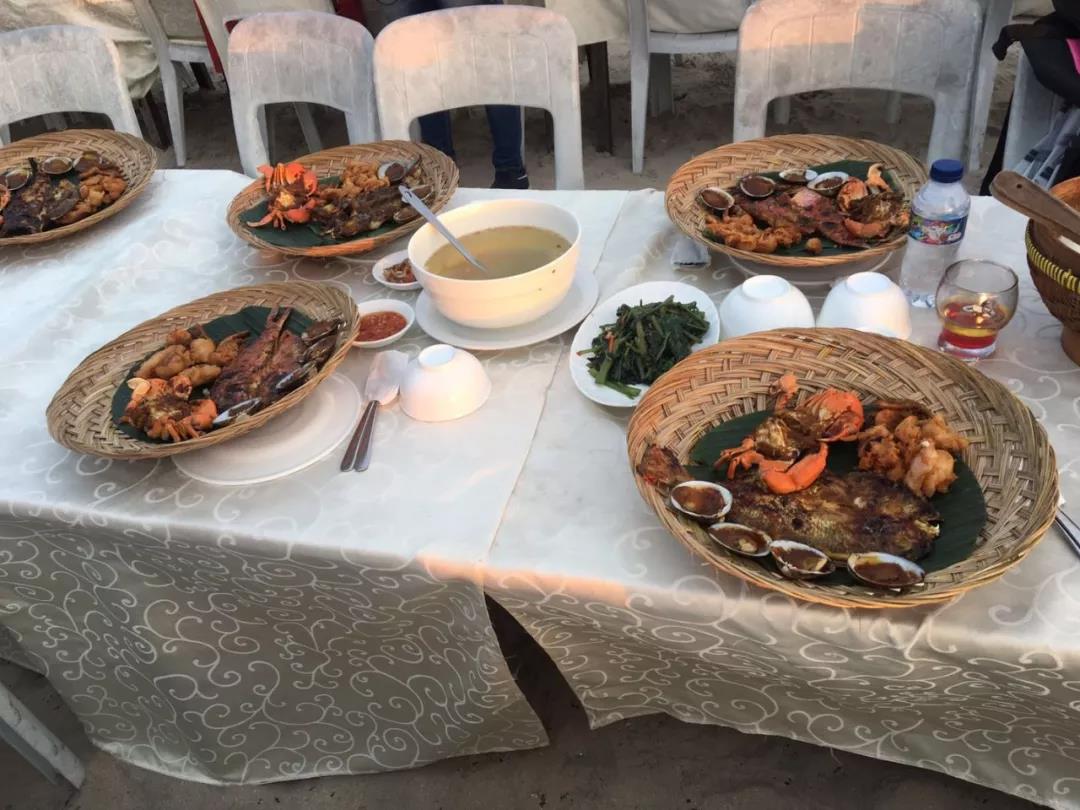 沙滩上成排的烧烤,长长的餐桌就搭在倾斜的沙坡上,摆上各种调料和瓜果,随着香味传来,用椰树壳烧烤后的各种海鲜一一递上,有烤大虾,烤鱿鱼,烤大蟹,还有其它叫不上名来的海味, 开启美酒,尽情痛饮。