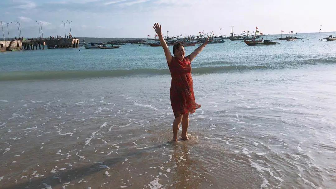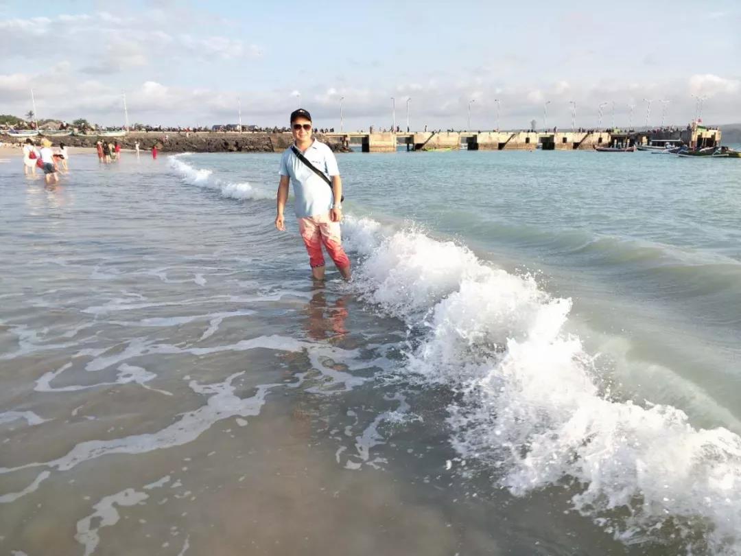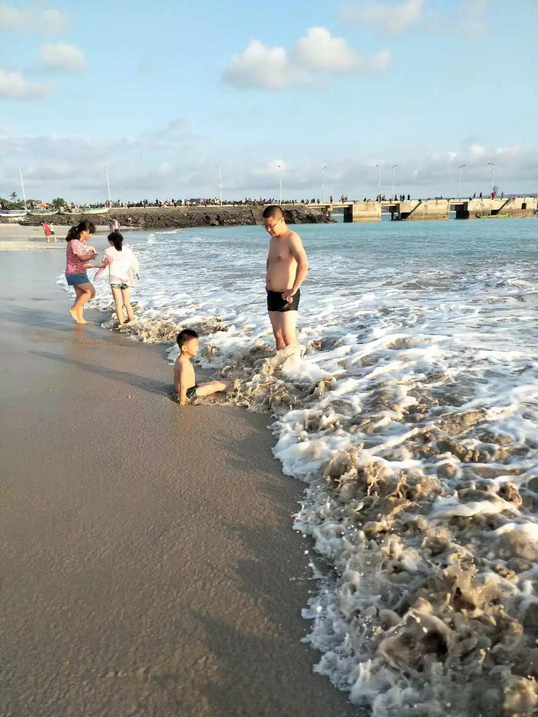 金巴兰海滩的确与众不同,它的海水不是清澈湛蓝的那种,而是褐色泛着白浪花,但它的波浪委婉而有力,拍在你的脚上明显能感受到它的不可征服。它的海滩结实而又平坦,脚踩下去不会有坑,你就是再用力也只会留下一个模糊的脚丫,被海风一吹就踪迹全无。它的海滩与沙滩界线很是分明,沙滩宽阔而又厚重,沙子细腻而又温暖。