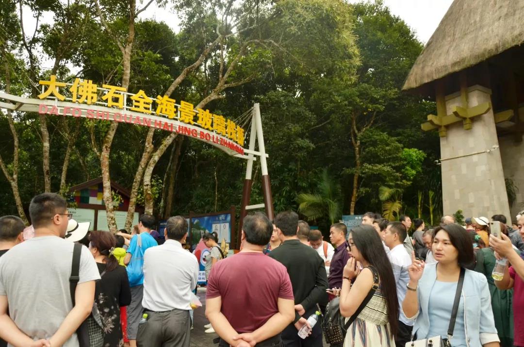 大佛石全海景玻璃栈道位于亚龙湾热带天堂森林公园之巅,最高处海拔450米。栈道环绕世界最大天然弥勒石佛而建,全长400米,最宽处10米,包括凌空台、七彩天梯、彩莲望佛台、彩虹之路、山盟海誓及心心相印等景点。行走在玻璃栈道上,可以俯视雨林山谷、远眺亚龙湾胜景。