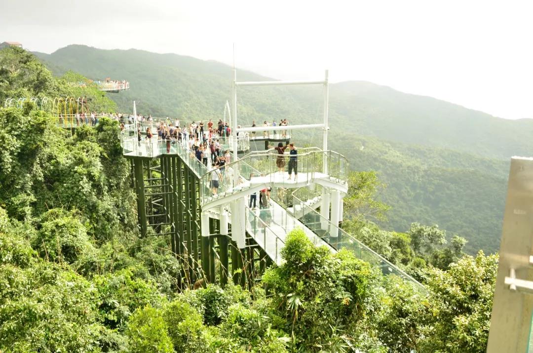 漫步在玻璃栈道仿佛行走在蓝天白云的幻影中,亚龙湾的超美海景尽收眼底。可谓是上可仰观天高云淡,下可俯视逾百米深的雨林山谷,前可远瞰“天下第一海景”亚龙湾。胆战心惊之余,这条栈道更可享受凌空而行的快乐。