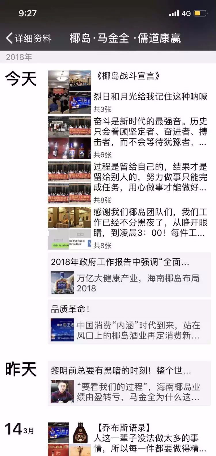 3月14日深夜,马金全在微信上更新了一条朋友圈:春节后19天以来,海南椰岛在产品设计、体系建设、团队组建、糖酒会布局、招商策略、商业模式战略、客户合作等方面紧急部署,为迎接第98届成都春季糖酒会做准备。