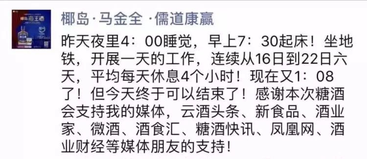 椰岛酒业在短短六天里实现2亿的签约订单背后,细心的朋友发现,马金全和他的团队平均每天仅休息4个小时。