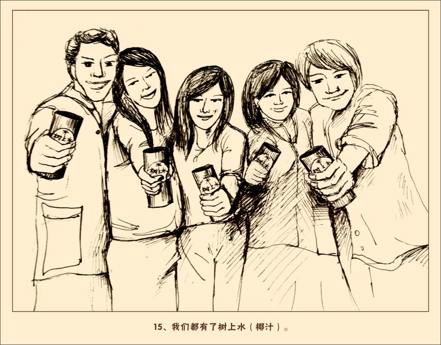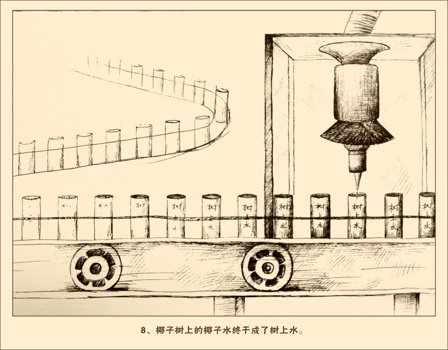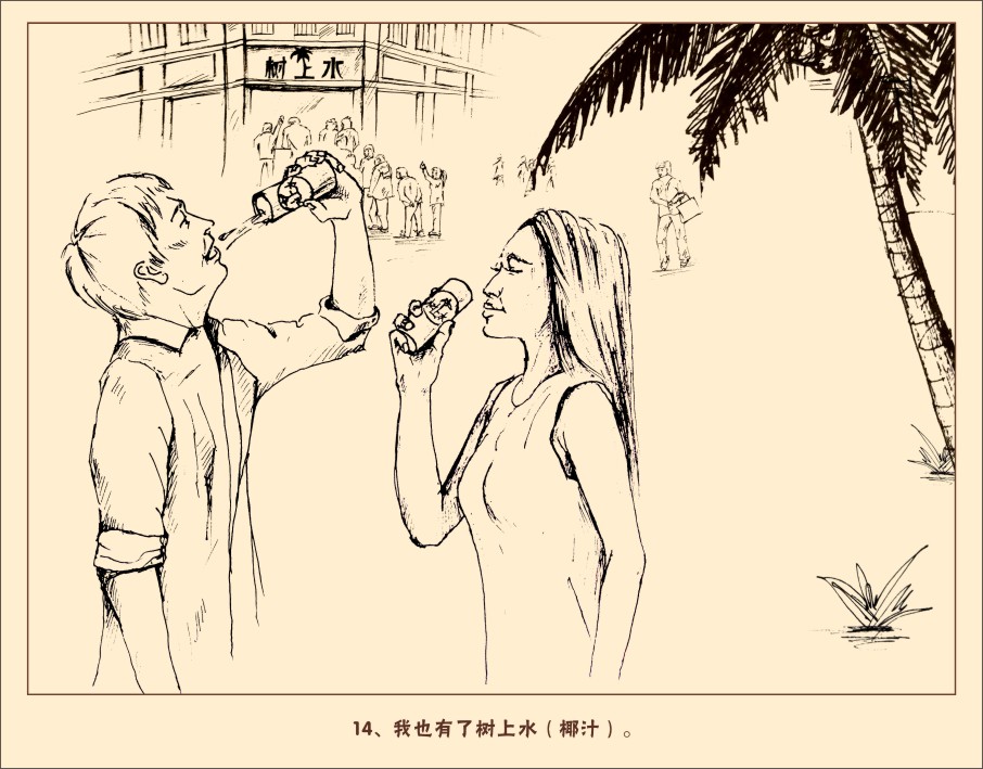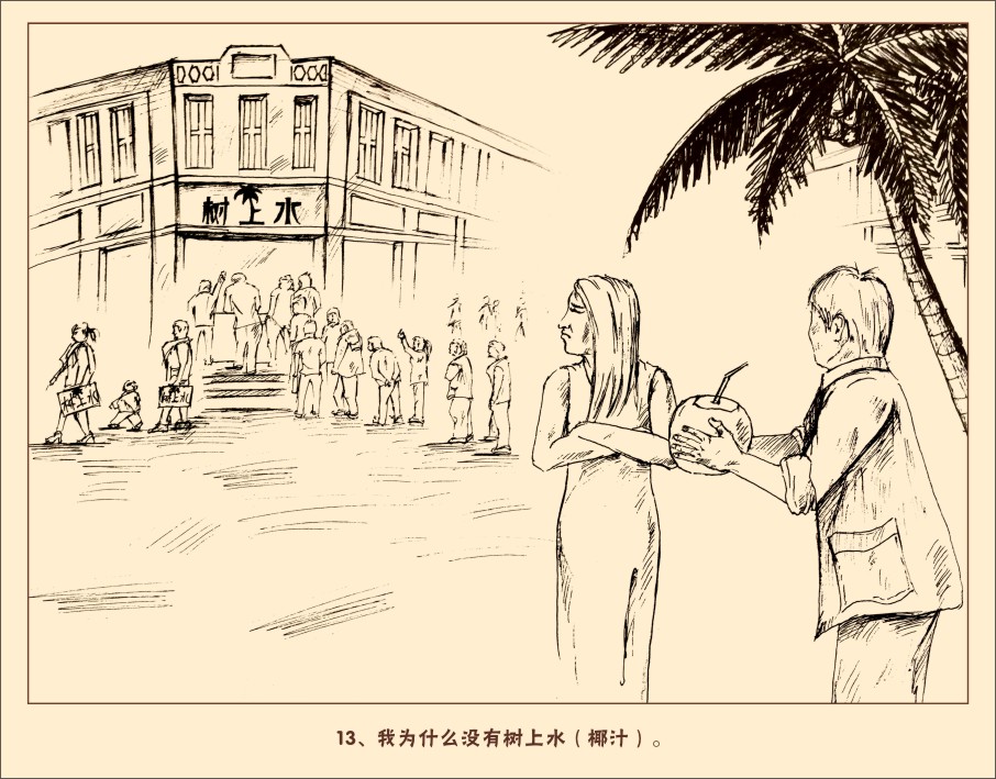 这是一个真实的故事:热恋中的女孩撒娇:“我要天上的星星”,憨厚的小伙子看着菜单,为难的不知该说啥,女孩换了一个要求:“我要树上水”!小伙子还是不知所措。这时,他看见餐厅里有一位老先生非常有风度地在给老奶奶往玻璃杯里倒“树上水”椰子汁,旁边稚气未脱的小男孩也学着老先生一本正经地在给小女孩玻璃杯里倒“树上水”椰子汁。小伙子一下全明白了,大声道:“先来两罐树上水”!老先生老奶奶、小男孩小女孩一惊,接着以教育的口吻说道:“树上水---爱的滋味!”