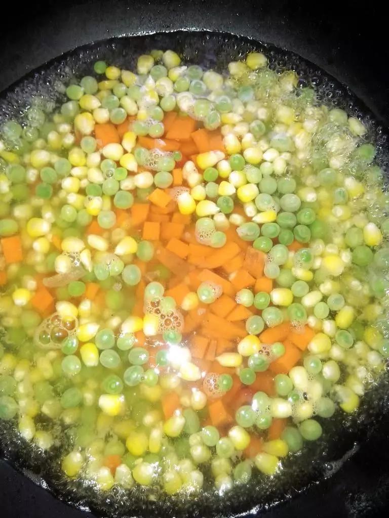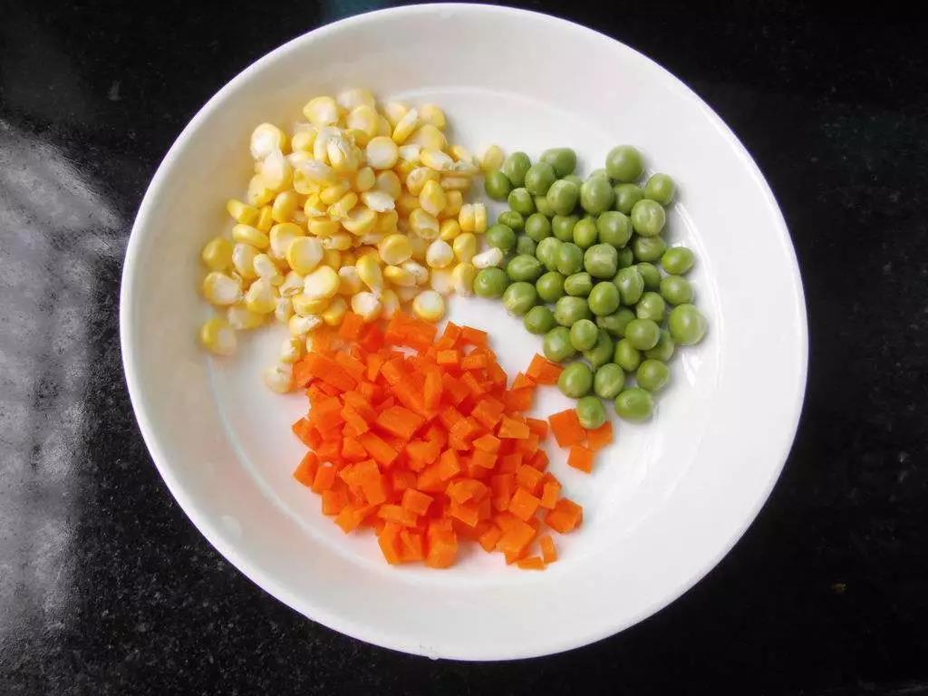 ⒈ 将豌豆、玉米剥好,胡萝卜切丁,洗净备好。