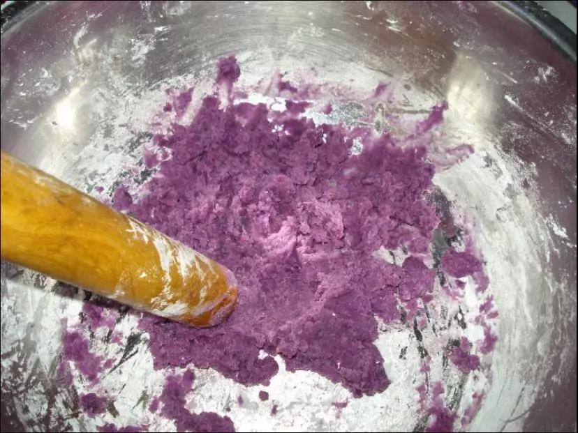 ⒋另外用一个盆,将紫薯也捣碎,加木薯粉揉成面团。