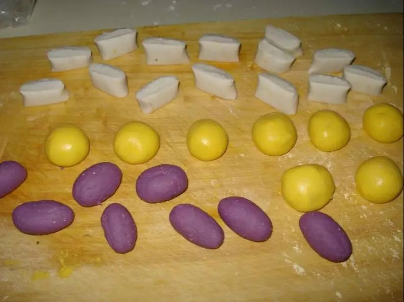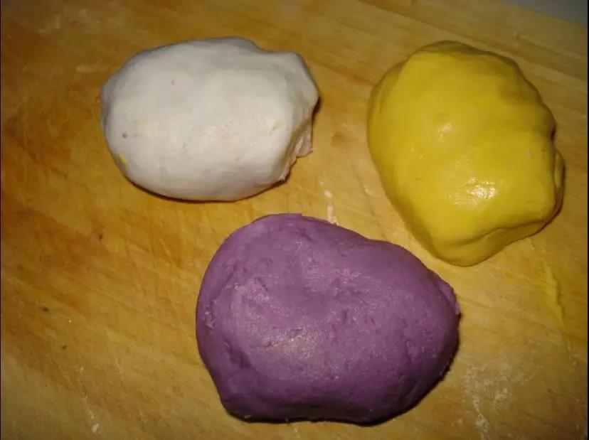 6.把三种面团分别根据自己的喜欢,切或搓成小球。