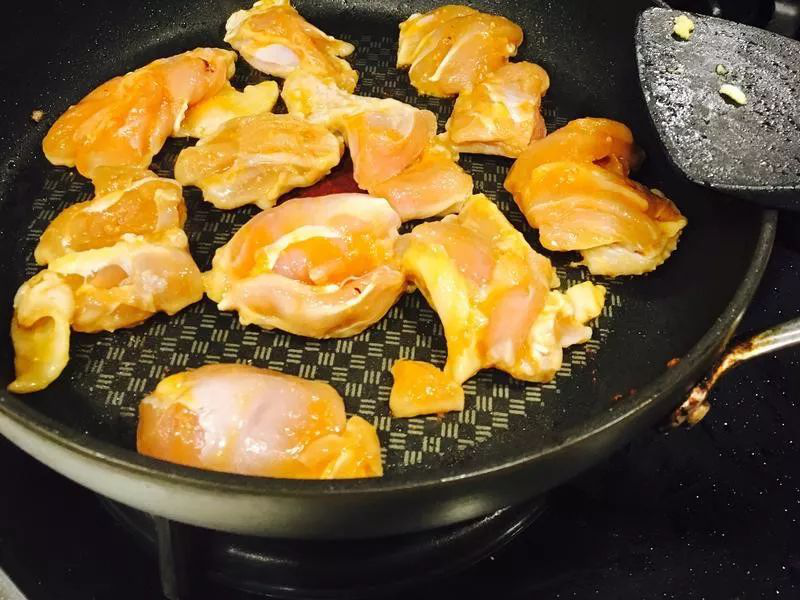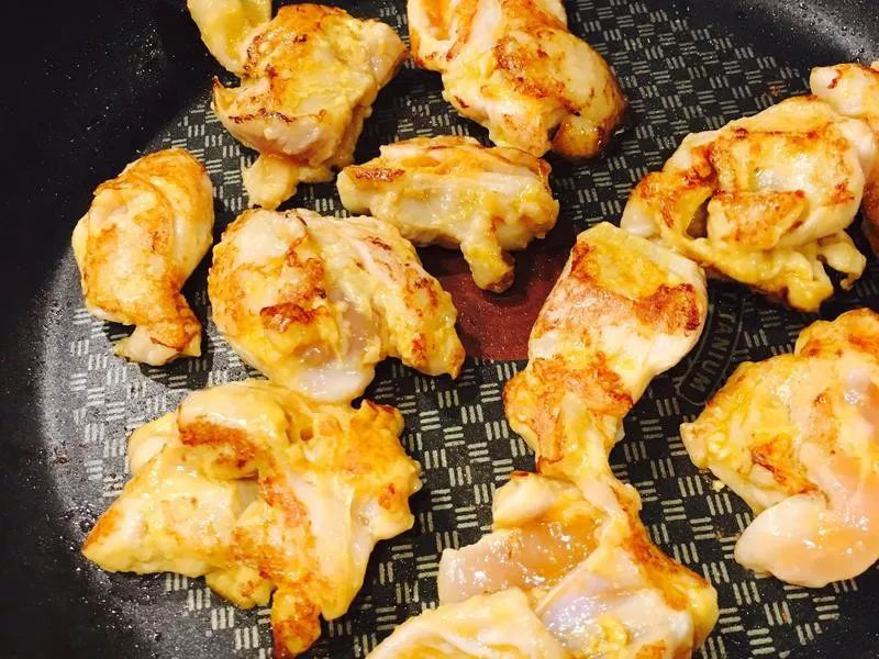 ⒉ 锅中再次放油烧热后,将鸡扒煎至金黄色。