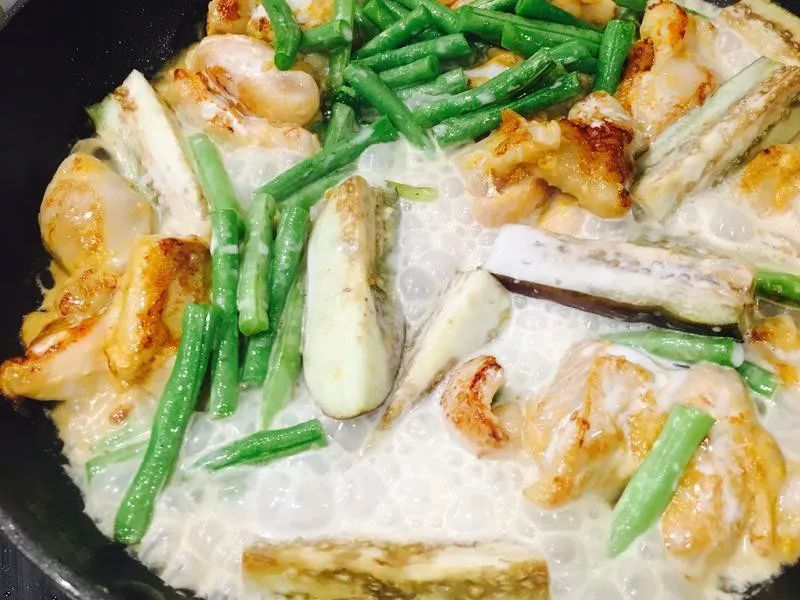 ⒋将树上水·椰子汁与水、盐、糖,以及刚炒的蔬菜一起倒入锅中煮至水开。