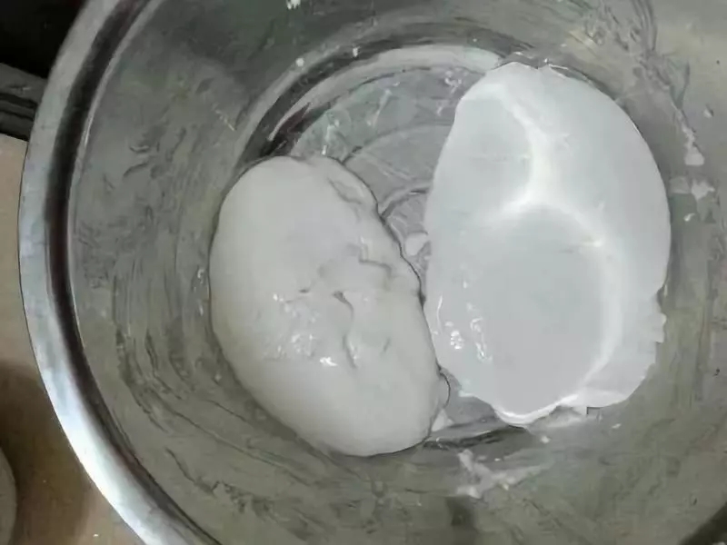 2.马蹄粉分成2份,其中一份和熬制好的糖浆混合成糖浆马蹄液;另一份马蹄粉加入树上水椰子汁,混合成椰汁马蹄液。