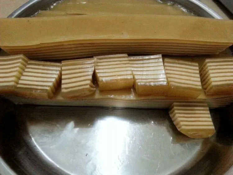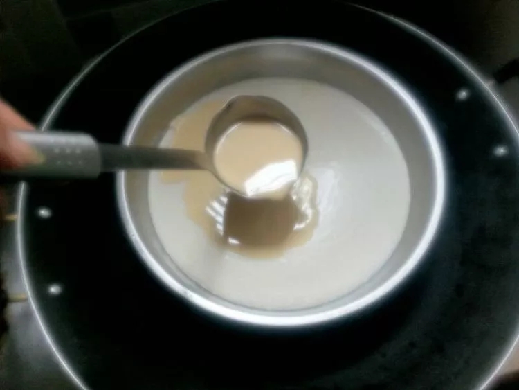 3.蒸锅蒸制。大火将水烧开后,先在蒸锅里面放入2勺糖浆马蹄液,待大火蒸10分钟直至凝固成透明,再倒入2勺椰汁马蹄液,蒸熟凝固。依次反复。